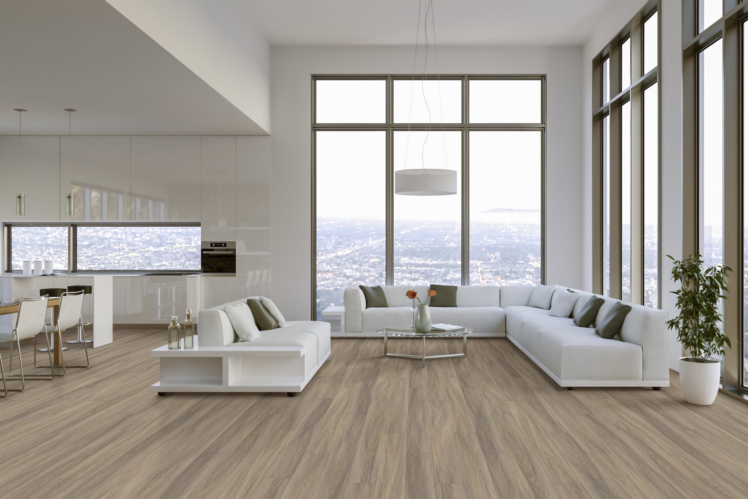 Happy Feet Pinnacle Sussex 7″ HF1205 LVP flooring features a realistic natural wood grain texture with a subtle matte finish, mimicking the look and feel of genuine hardwood without the drawbacks. Its enhanced durability and moisture resistance make it suitable for high-traffic areas and moisture-prone environments, while the rigid core construction ensures stability and resistance to warping or buckling. The 7″ wide planks and click-lock installation system provide a seamless, elegant look with minimal gaps, enhancing the overall aesthetic appeal and reducing installation time.